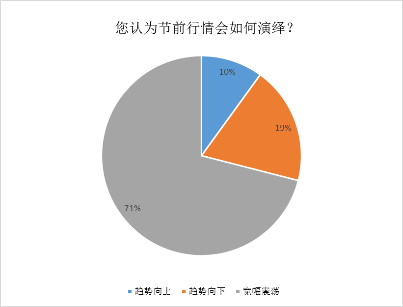 对于A股市场春节前及节后一段时间的表现,目前私募业对股指走势的整体研判,大体仍定调为“震荡行情”。相关问卷调查显示,有71%的私募表示倾向于认为市场将在节前延续宽幅震荡格局。此外,有19%的私募认为节前市场趋势或向下,10%的私募认为节前市场有望明显走强。