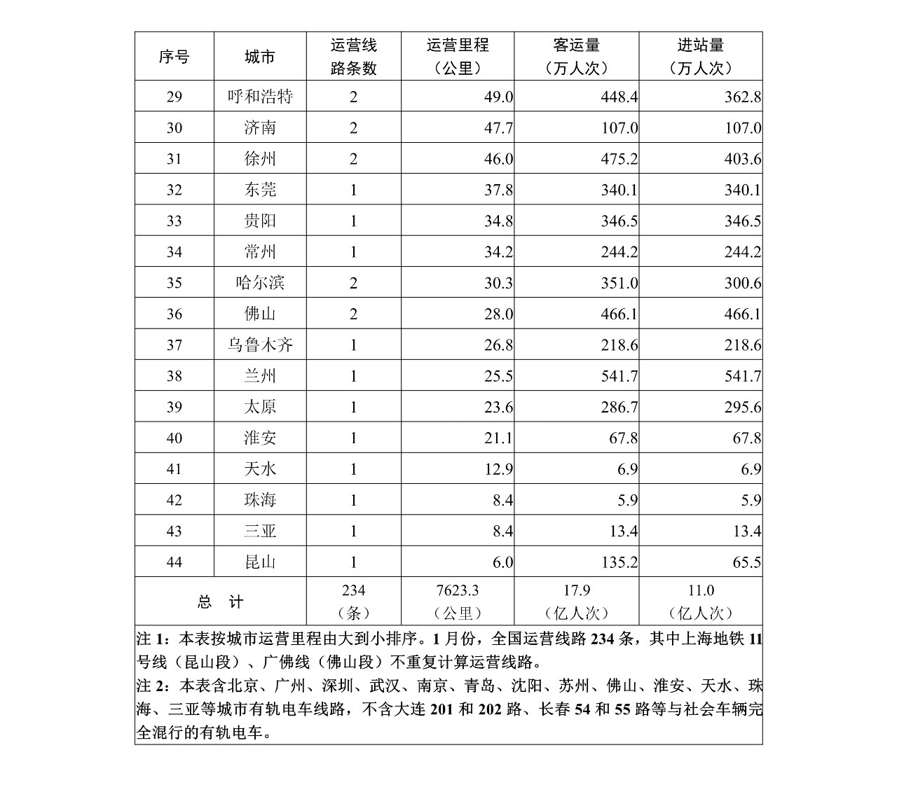交通运输部数据显示,2021年1月,全国(不含港澳台,下同)共有44个城市开通运营城市轨道交通线路234条,运营里程7623.3公里,实际开行列车229万列次,完成客运量17.9亿人次,进站量11.0亿人次,未发生运营安全责任事故。