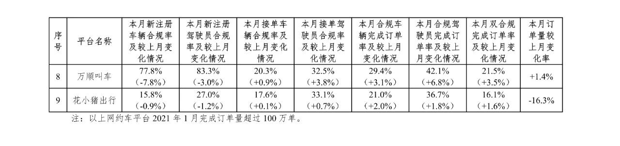 2021年1月,全国网约车监管信息交互平台共收到订单信息7.3亿单。其中,当月订单量超过100万单的网约车平台公司中,按双合规完成订单率从高到低的分别是享道出行、曹操出行、首汽约车、T3出行、如祺出行、滴滴出行、美团打车、万顺叫车、花小猪出行。