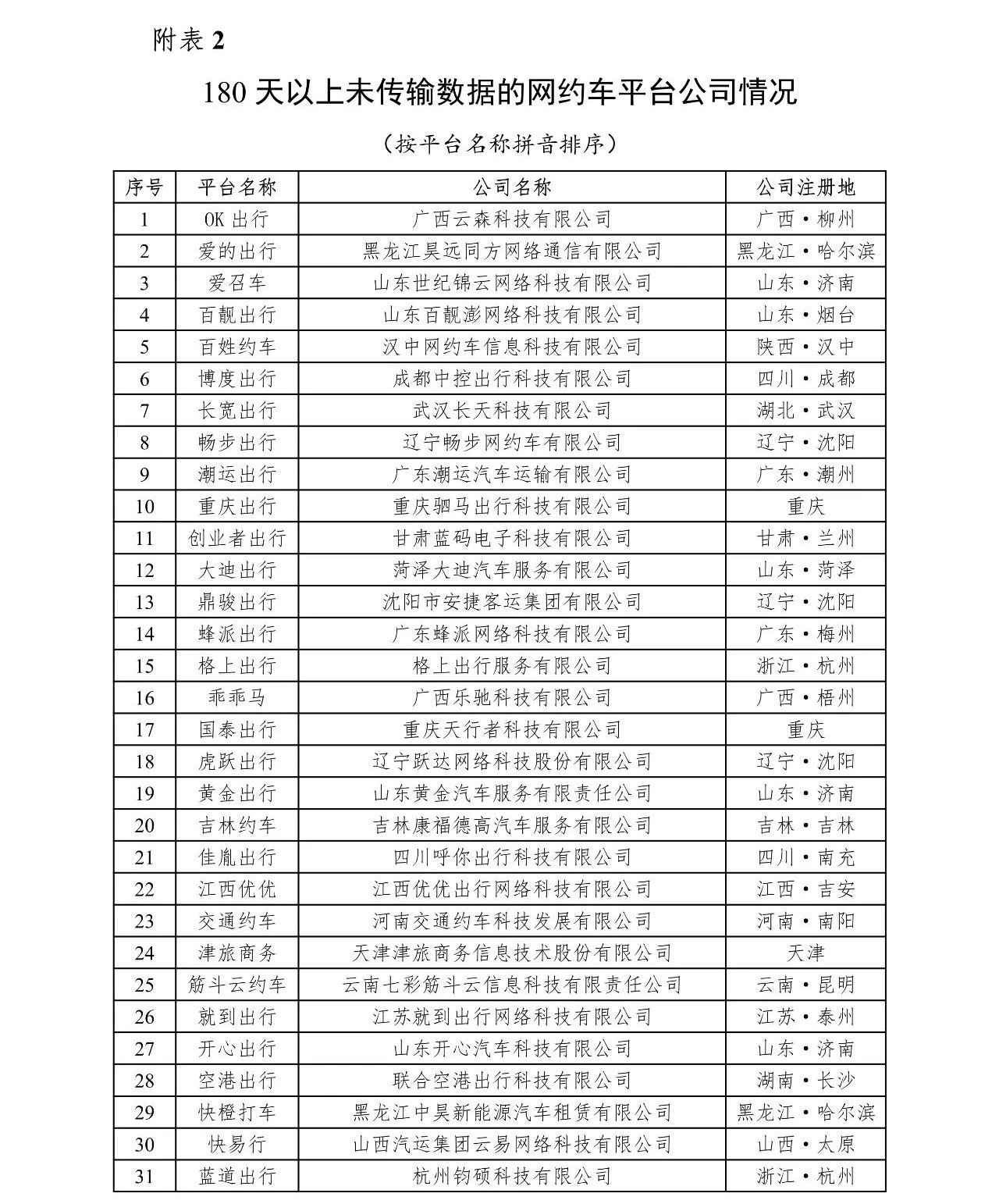 在上月公布的累计180天未传输数据的72家网约车平台公司中,安安约车、犇犇约车、乘风行出行、甘薯出行、克穷专车、蔷薇出行、容出行、如约的士、网乐专车、熙客出行、有象出行等11家网约车平台公司已于1月份开始传输数据。新增5家已累计180天未传输数据的网约车平台公司,包括:南京同游天下汽车租赁有限公司(秒走打车)、汉中网约车信息科技有限公司(百姓约车)、成都中控出行科技有限公司(博度出行)、杭州钧硕科技有限公司(蓝道出行)、华夏老兵出行吉林集团有限公司(老兵出行)。(总台央视记者 唐颖)