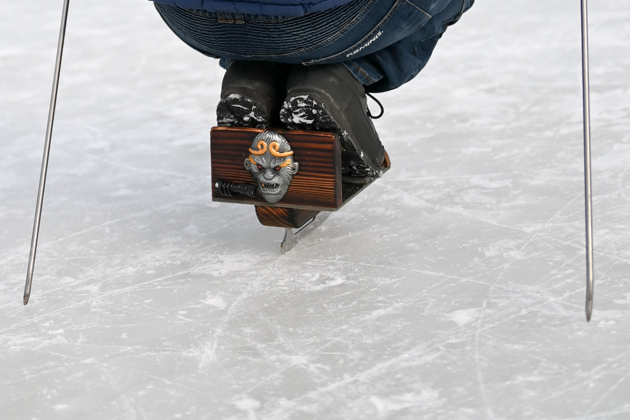 “这是我这两天新做的,做了两天两夜。”橙色的踏板,蓝色的冰刀,冰车前还能安置小型移动摄影机。爱好者李春雷向大家展示着自己的最新作品。李春雷2020年12月开始参与单腿冰车运动,短短两个月时间,他已经为自己和“驴友”们制作了6台单腿冰车。“这次又进行了重新改良和设计,外观更美观,也更容易保持平衡了。”李春雷对自己的每一件作品都如数家珍。