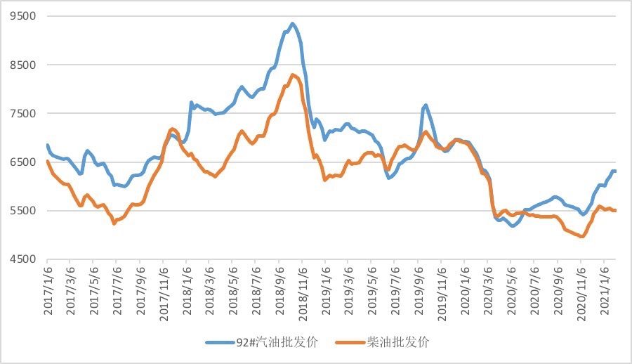 国内汽柴油批发价格周度均价走势图(单位:元/吨)