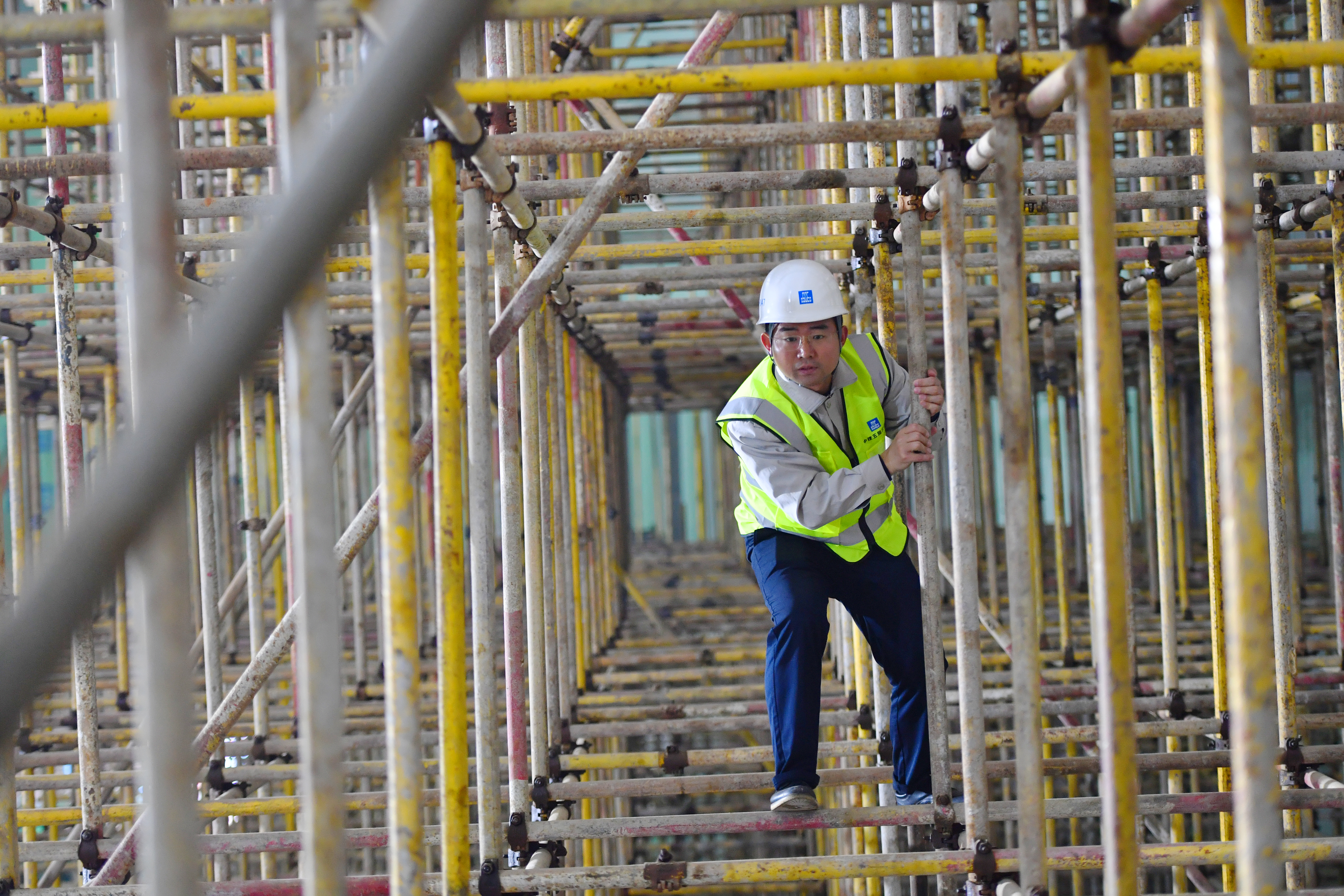 为了解决长距离向下输送混凝土存在的离析、爆管等问题,郭朋鑫和同事们做了数十次试验,反复验证材料配比和施工工艺;为了解决巨型平台的支撑问题,他们“脑洞大开”地借鉴桥梁施工技术,创新运用贝雷架支撑体系……