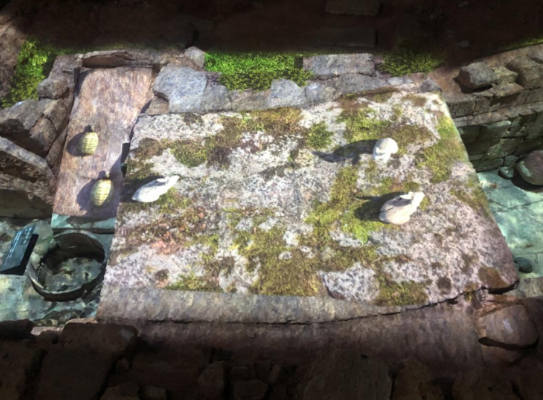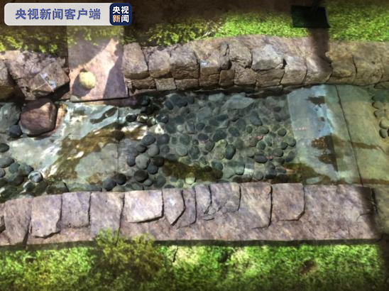 沿玻璃栈道参观,可以看到南越国曲流石渠声光电复原展示,在展示技术手段上,利用了20台多媒体视频投影机、水纹灯、控台等设备组合,通过三维建模仿真等技术勾勒曲流石渠全貌,模拟整条曲流石渠流水动态效果,在急弯处、弯月池、渠陂、斜口、石渠周边等关键节点做相应画面,复原出曲溪潺流、龟鳖爬行、游鱼戏水、玉兔奔跑、绿草如茵、小桥流水等园林景观影像,再配合声控特效,重现两千年前王宫御苑内溪涧鸣泉、鸟啼清幽、生机盎然的岭南园林美景。