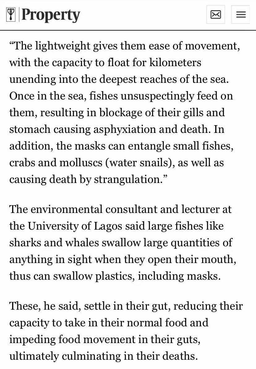 拉各斯大学的环境顾问和讲师表示,鲨鱼和鲸鱼这样的大鱼张开嘴时,会吞下大量可见的东西,因此会吞咽包括口罩在内的塑料。这些食物定居于肠道,降低了他们摄取正常食物的能力,阻碍了食物在肠道中的流动,最终导致死亡。