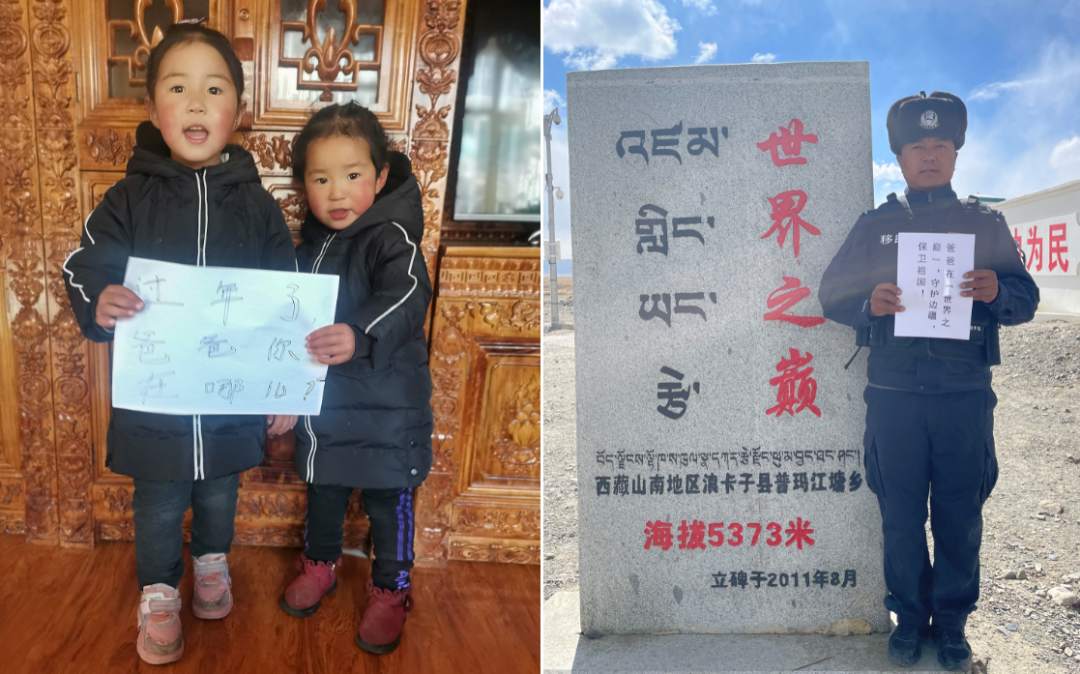 这是一张拼版照片,大女儿叫洛桑卓玛,今年5岁,小女儿叫益西卓嘎,今年3岁。洛桑曲扎和妻子索郎卓玛,一个是浪卡子县普玛江塘乡的移民管理警察,一个是山南市的特警,夫妻俩已经三年没有在家陪两个女儿过年了。春节将至,洛桑曲扎坚守在5373米,位于中不边境,全国海拔最高的普玛江塘边境派出所,守护边境,保卫祖国,洛桑曲扎说,一家不圆万家圆,能够在世界之巅守卫万家灯火,自己是幸运的也是幸福的。 徐斌权 摄