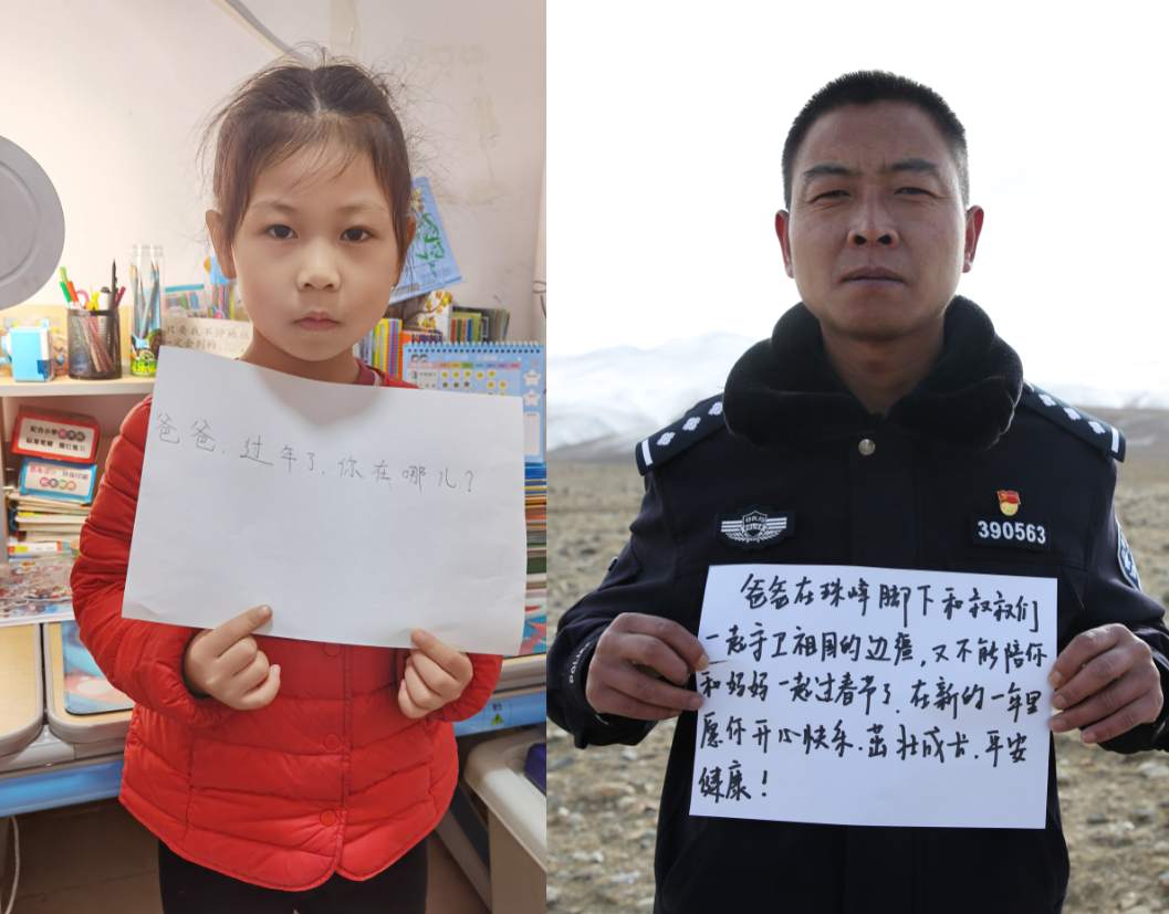 这是一张拼版照片,女儿闻李萱,今年6岁了,5年没有和爸爸在一起过年了,本来满心期待爸爸今年可以回家陪自己和妈妈团圆,可爸爸作为副所长由于工作任务重,只能推迟休假计划,女儿最近打视频电话都不理爸爸,好在妈妈做工作,她才同意把心里想念爸爸的这句话写出来。爸爸闻飞,是西藏出入境边防检查总站日喀则边境管理支队珠峰边境派出所副所长,春节快到了,爸爸和战友们依旧像珠峰的石头一样坚毅,守卫在海拔5200米的珠穆朗玛峰脚下,护卫着中尼边境辖区的安全和稳定,为冬季赴珠峰旅游观光的游客保驾护航。 彭维熙 摄