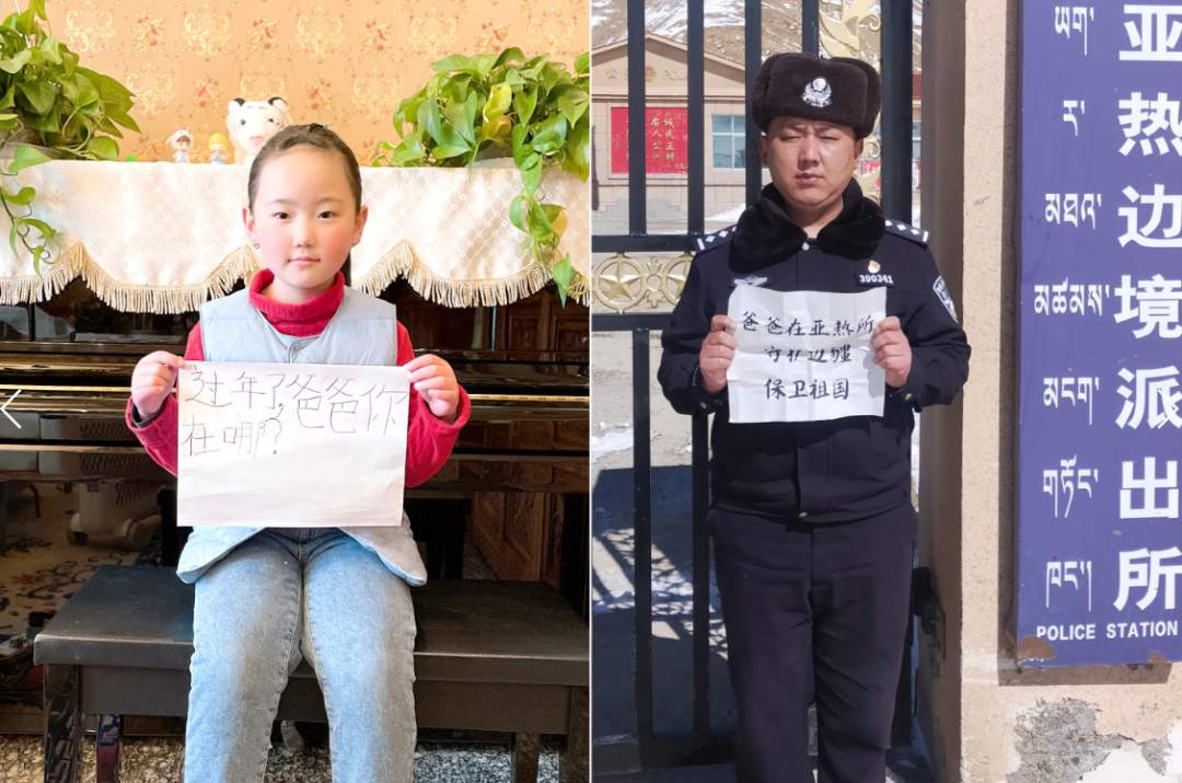 这是一张拼版照片,小女孩叫旦增诺央,今年8岁,从来没有和爸爸在一起过年,今年又只能和往年一样过一个“没有爸爸”的春节。爸爸旦增尼玛是日喀则边境管理支队亚热边境派出所所长,春节将至,他和战友们坚守在5300多米的中尼边境一线,他通过这种方式表达对孩子的思念,相信慢慢长大的孩子一定能够理解自己。今年,亚热边境派出所在全国“火”了一把,一个什么也不说的派出所,用自己的默默奉献和艰苦奋斗,让祖国和人民都知道了他们。 刘志武 摄
