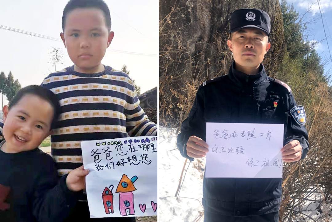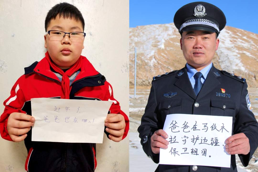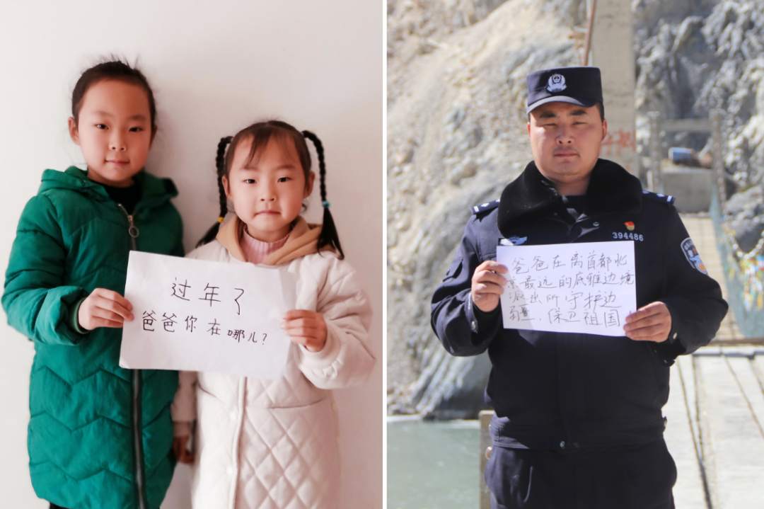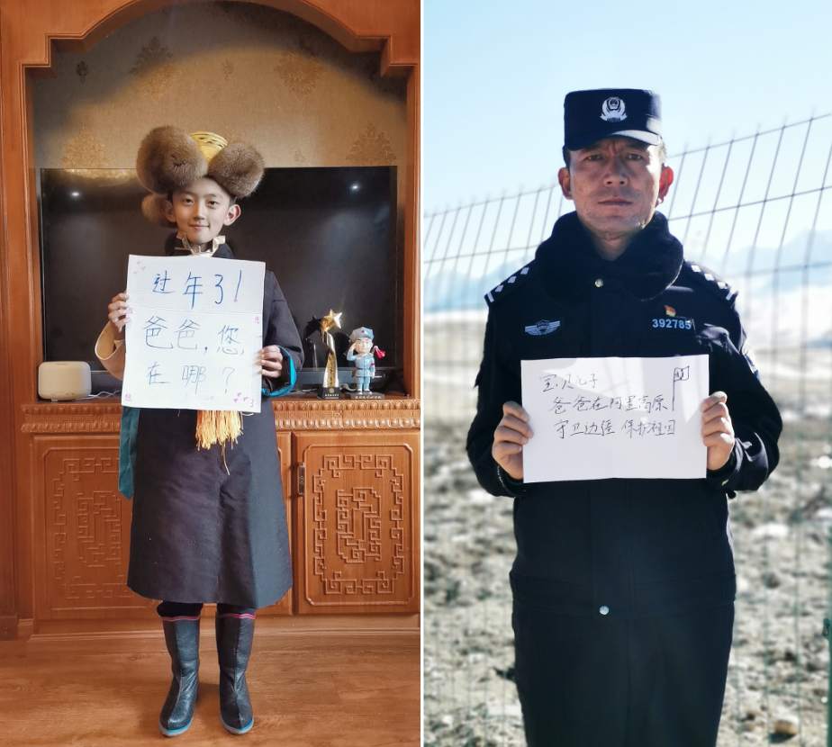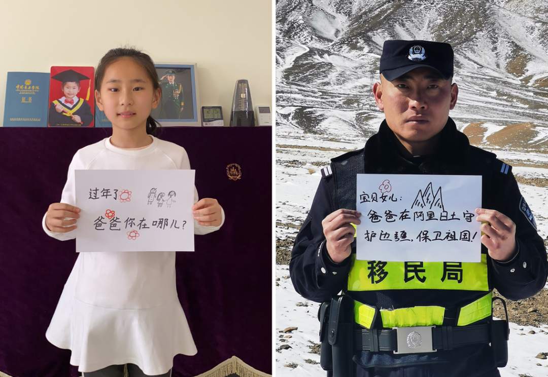 这是一张拼版照片,孩子名叫郑舒涵,今年8岁,7年都没和爸爸一起过年了,今年又只能和妈妈一起在山东老家过年。爸爸郑伟是西藏出入境边防检查总站阿里边境管理支队日土边境派出所的所长,春节期间,他将继续带领战友们坚守在海拔4600米的斯潘古尔执勤点,和所有春节不回家的战友们一起,守卫在雪域大地的边境一线。郑伟常说:“有国才有家,自己2001年戍边以来,经历过太多的边境故事,说小点,自己把工作干好了,女儿和家人在内地就可以平平安安生活,说大点,如果边境都没有人守卫,那山河何来无恙、人民何来安康。” 任博 摄