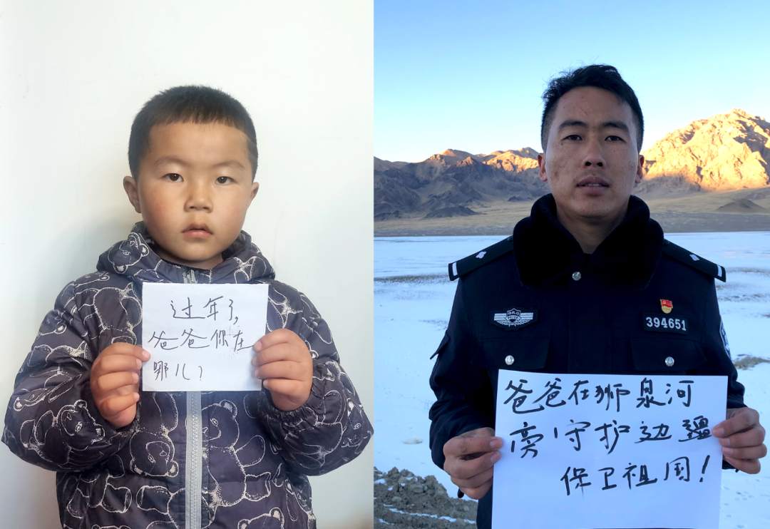 这是一张拼版照片,孩子名叫平措扎西,今年5岁,3年没和爸爸一起过年了,今年又只能和妈妈在日喀则过年,一个在月亮的日喀则,另一个在爱情的狮泉河。爸爸格玛次仁是西藏出入境边防检查站阿里边境管理支队扎西岗边境派出所民警,今年春节,他和他的战友将坚守在海拔4400米,位于狮泉河下游的中印边境第一村——典角村,默默守护着边境一线的安全稳定。 汤子龙 摄