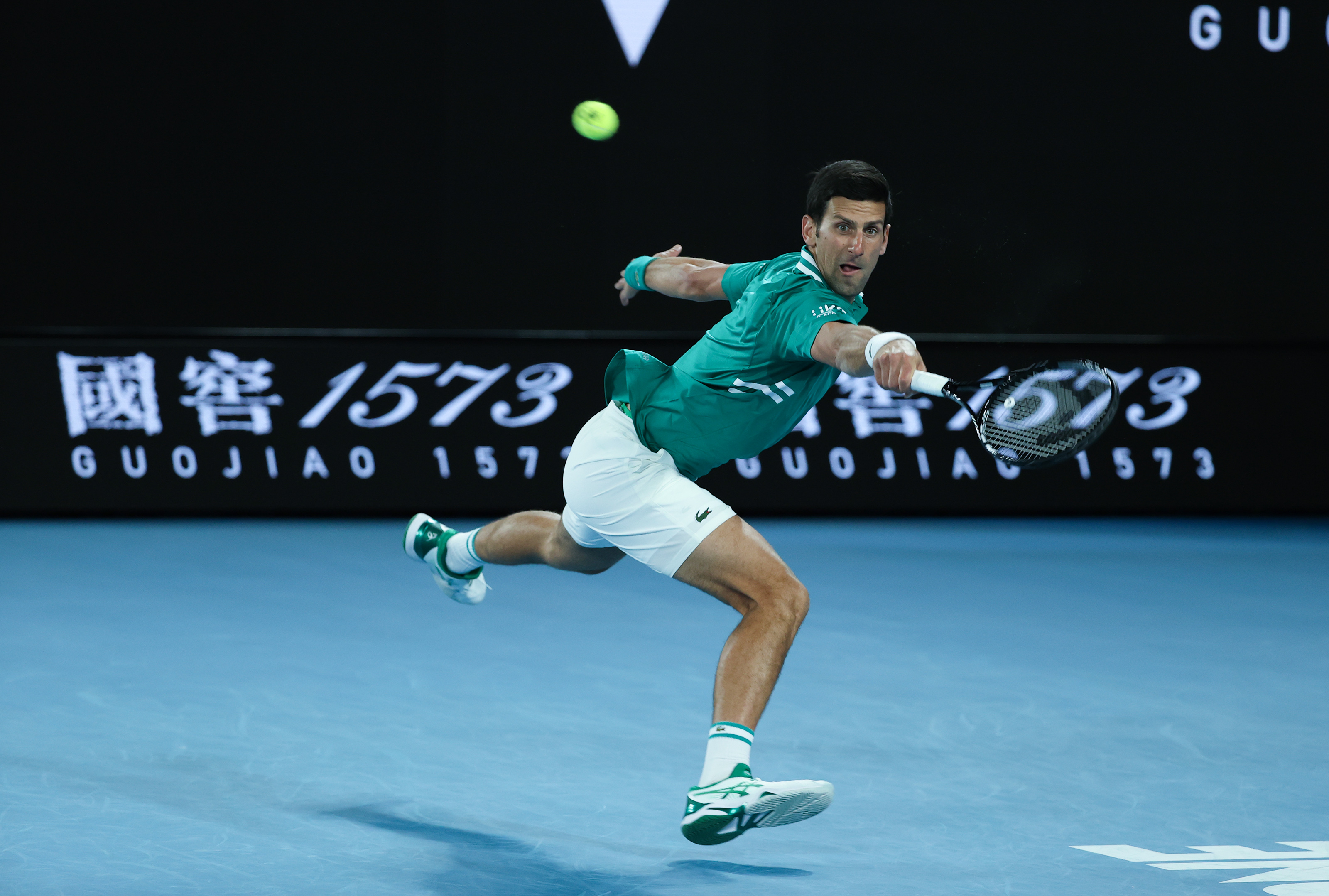 2月8日,塞尔维亚选手焦科维奇在比赛中回球。新华社发(胡泾辰摄)