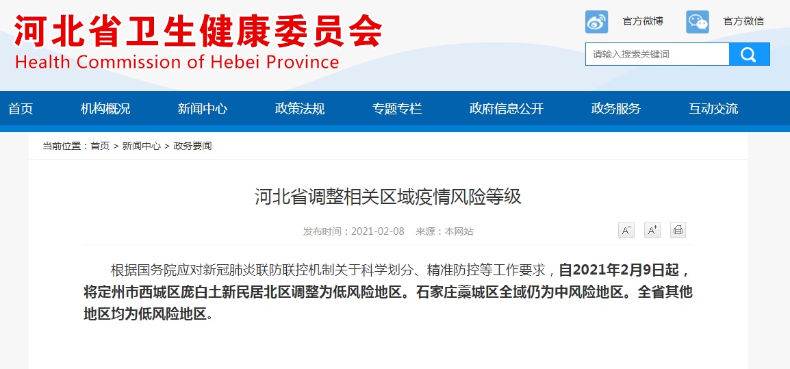 2021年2月8日,河北省卫健委发布《河北省调整相关区域疫情风险等级》的通知,通知全文如下: