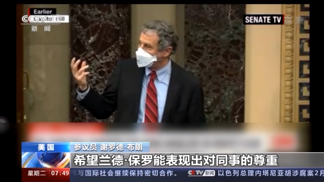 美国参议员 谢罗德·布朗:我希望兰德·保罗在大家面前戴上口罩,因为现在在参议院每个人时刻都戴着口罩。希望兰德·保罗能表现出对同事的尊重,在参议院走动和讲话时戴上口罩。
