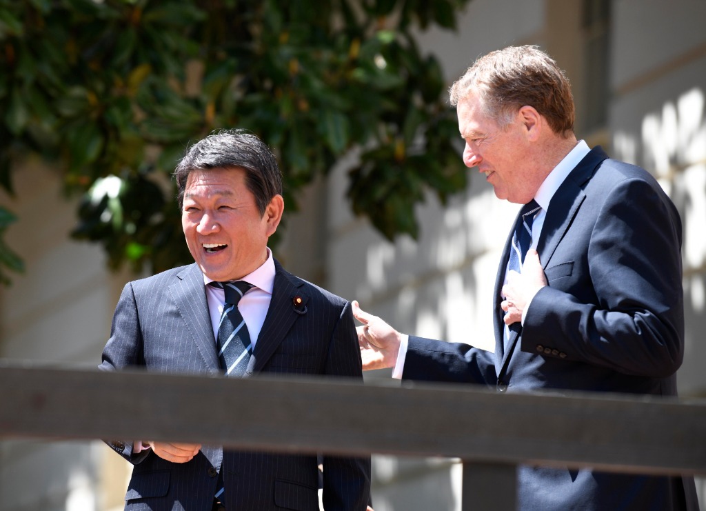 2019年4月16日,在美国首都华盛顿,时任美国贸易代表莱特希泽(右)与时任日方谈判代表、经济再生担当大臣茂木敏充举行会谈。(新华社记者刘杰摄)