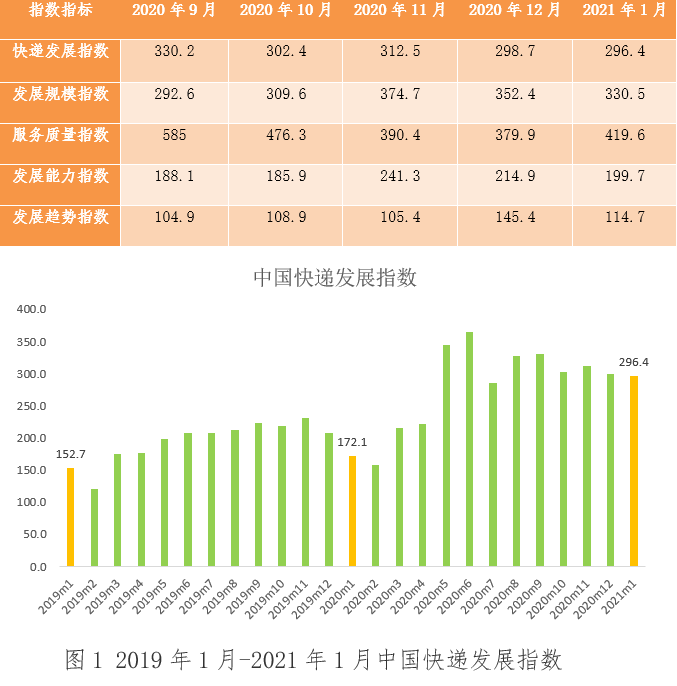 据测算,2021年1月中国快递发展指数为296.4,同比提高72.2%,同比增速创7个月来新高。发展规模指数、服务质量指数、发展能力指数和发展趋势指数分别为330.5、419.6、199.7和114.7,快递市场2021年开局良好。