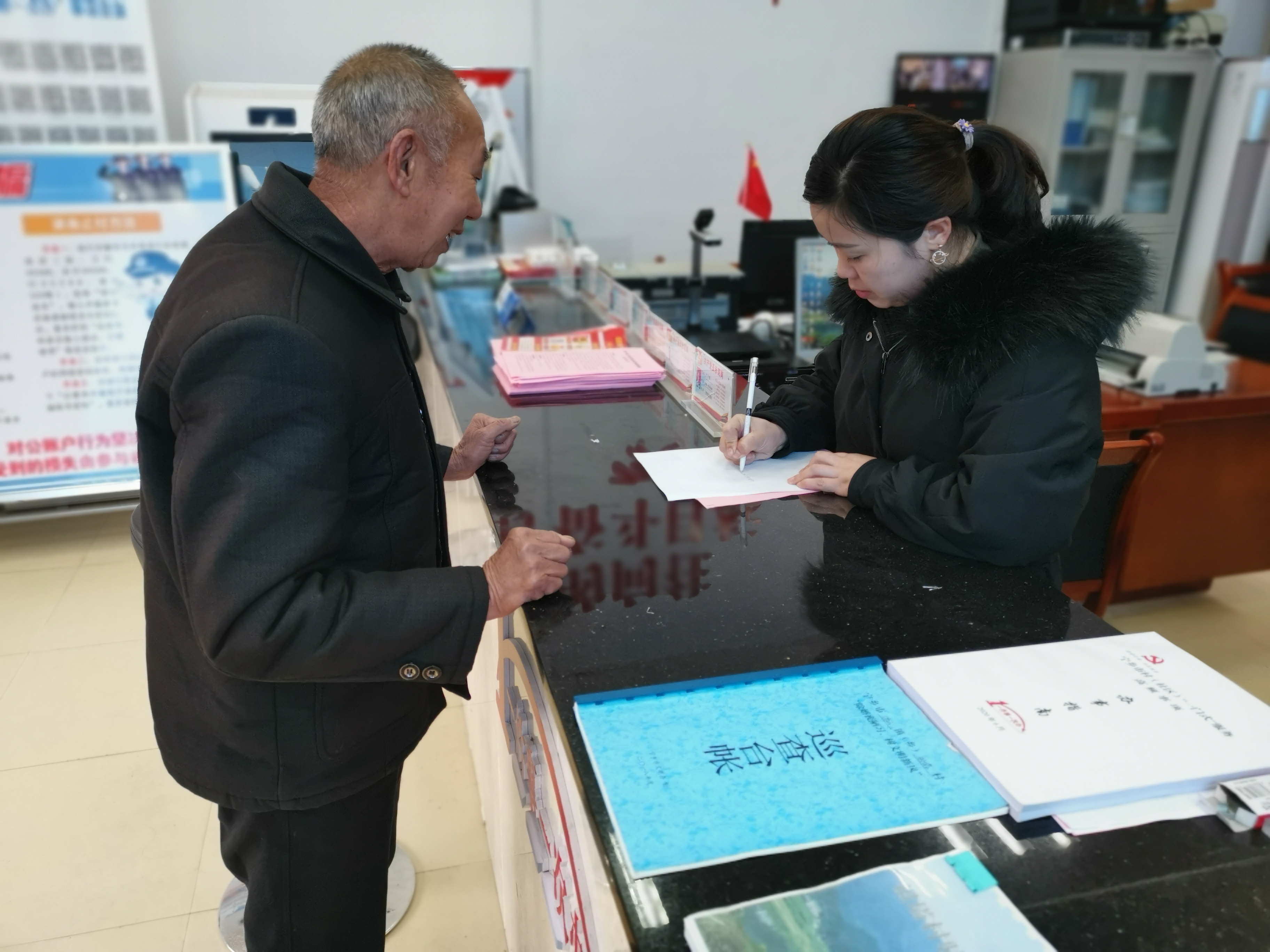 在湖南宁乡市沩山乡祖塔村村部,村委会政务专干夏艳辉正在接待前来办老年人优待证的村民陈正怡。(2月3日摄)新华社记者刘良恒摄