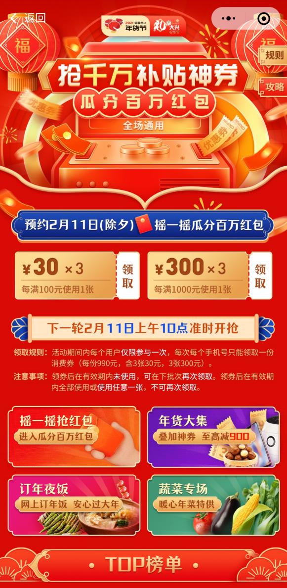 消费者还有机会获得“兴年福袋”一份,内含:定制春联、福字、红包等节日用品。除夕当天,大家还可以在“兴福汇”平台,参与“摇一摇抢百万红包”活动,瓜分100万元现金。此外,节日期间还有2000万的云上年货消费券供大家领取,大兴的百姓可以在线与亲朋好友互送贺礼、欢庆“兴”年!(总台央视记者 杜俐)