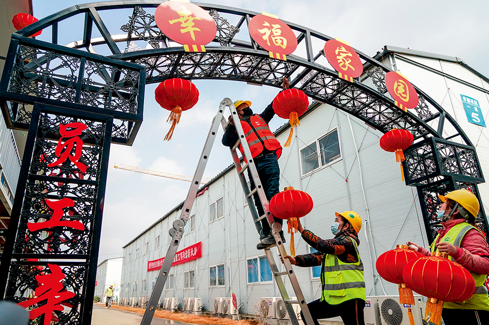 2月2日,中铁四局无锡地铁4号线具区路车辆段项目工地的外来务工人员挂上灯笼,迎接新春佳节的到来 李博摄/本刊