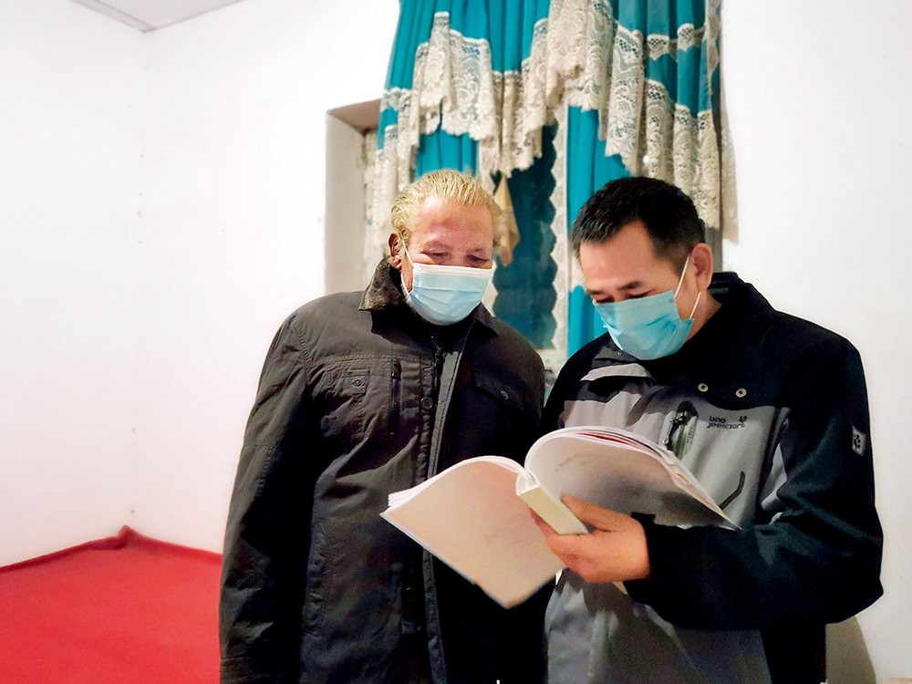 2021年2月3日,麦麦提·木萨(左)正在向包联干部了解脱贫政策