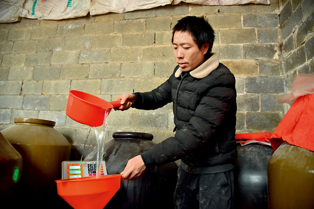 2021年2月4日,黔西县金兰镇清华村贫困户吴学友给顾客装酒 骆飞摄/本刊