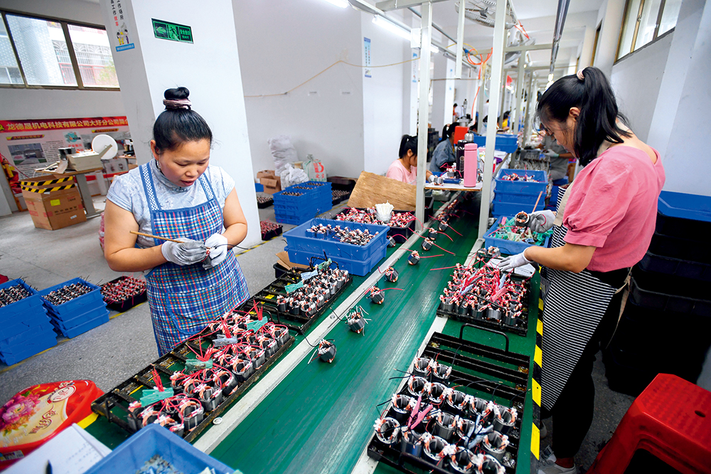 在位于湖南省江华瑶族自治县的湖南龙德晟机电科技有限公司大圩分公司生产厂房,工作人员在马达生产线上作业(2020年6月9日拍摄) 陈泽国摄/本刊