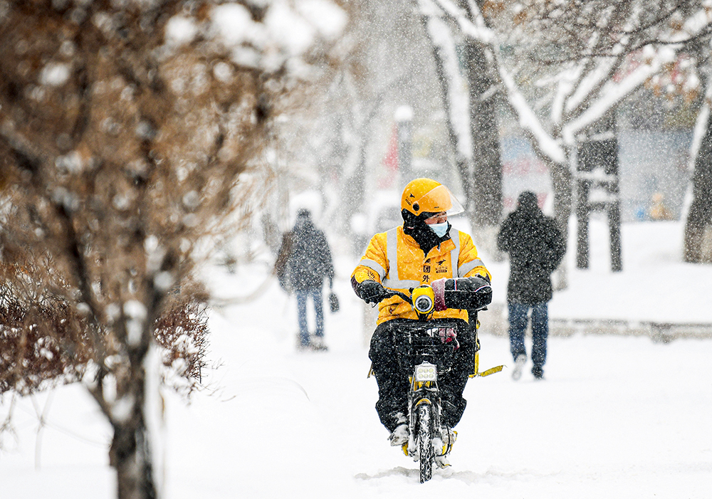 1 月 23 日,乌鲁木齐市光明路,一名外卖员在送餐路上 王菲摄 / 本刊