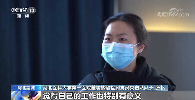 河北医科大学第一医院藁城核酸检测党员突击队队长 张帆:我们在每做一轮筛查完一轮以后,都会关注当地的阳性病例。当看到是零的时候,觉得自己的工作也特别有意义。