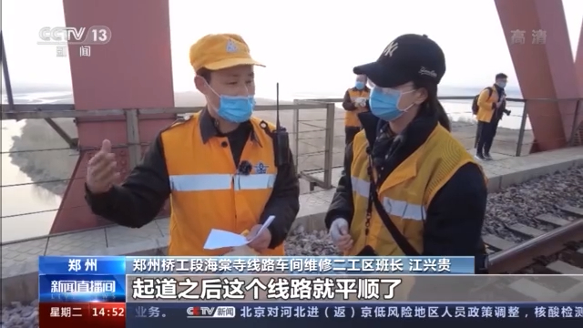 郑州桥工段海棠寺线路车间维修二工区班长 江兴贵:现在我们对好水平,就是这股钢轨与那股钢轨在同一个平面上。它的误差标准就是加减1毫米的标准。