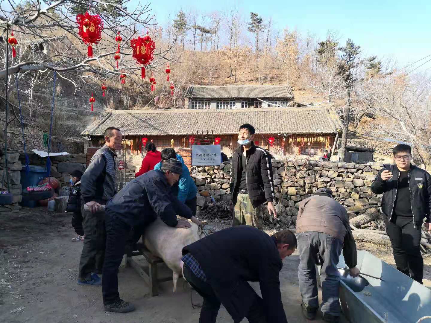 山坳里,一座座青瓦石墙的民宅高低错落。红灯笼、红窗花、红春联,喜气洋洋。远远传来一阵猪叫声,沿着蜿蜒的小路,走进村民马洪路家的小院,五六个村民正在宰杀年猪,山坡上,蹲满了看热闹的小孩。