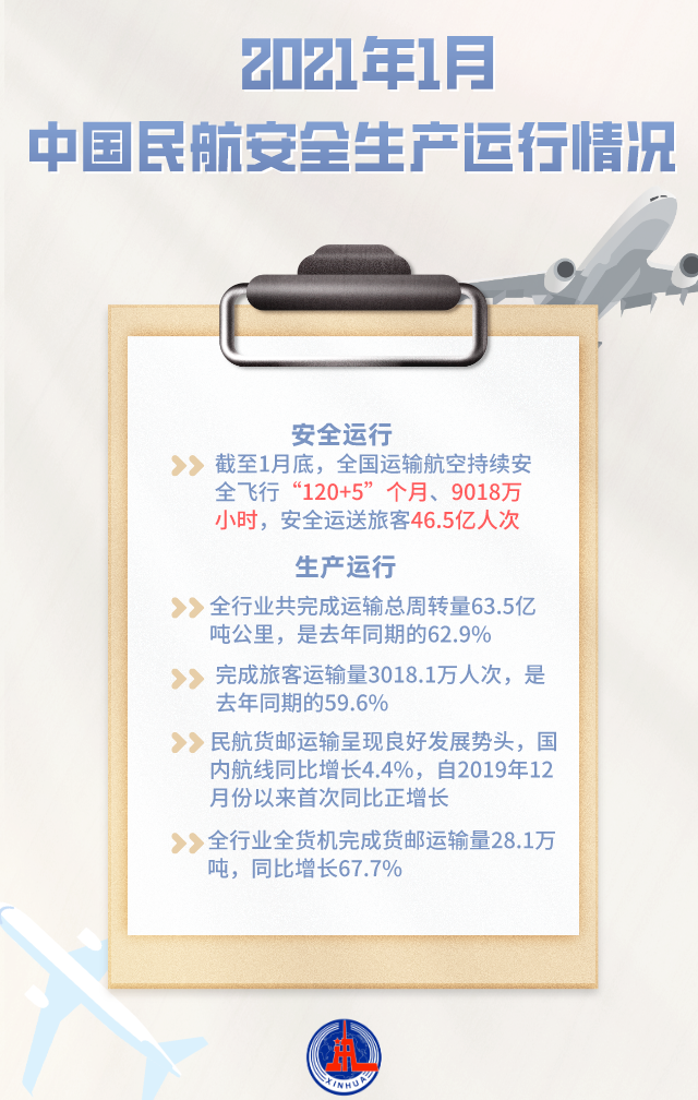 此外,1月,未发生运输航空事故,行业安全生产继续保持总体平稳态势。截至1月底,全国运输航空持续安全飞行“120+5”个月、9018万小时,安全运送旅客46.5亿人次。
