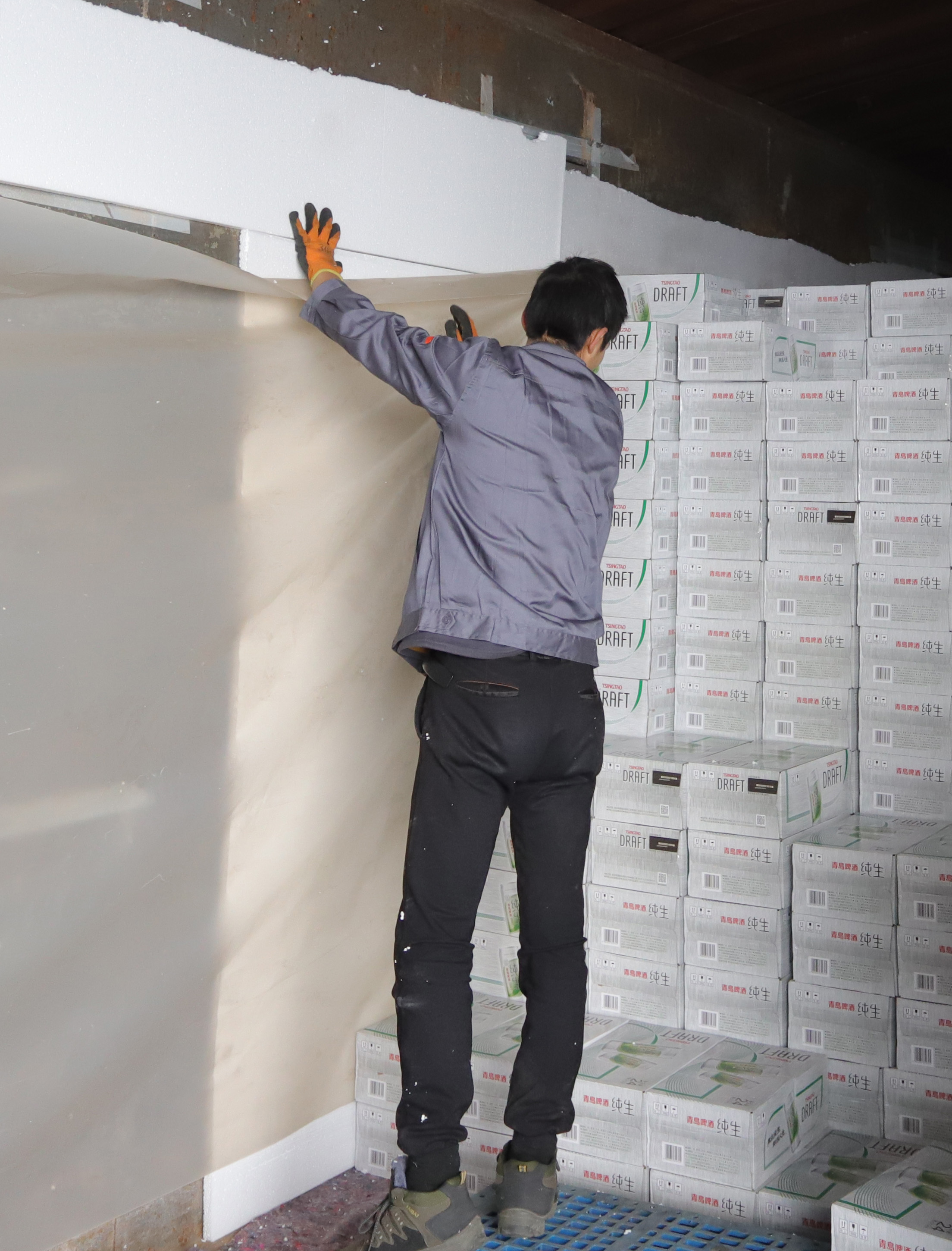 在娄山站的棚车车厢内可以看到,车厢的厢壁被包上了一层塑料膜,膜上则覆盖了一层厚约4厘米的泡沫板,现场工作人员管这些泡沫板叫作保温板。“这是我们专门为运输啤酒设计的暖房,是为了往东北地区运输用的。”娄山站站长宋伟涛说。