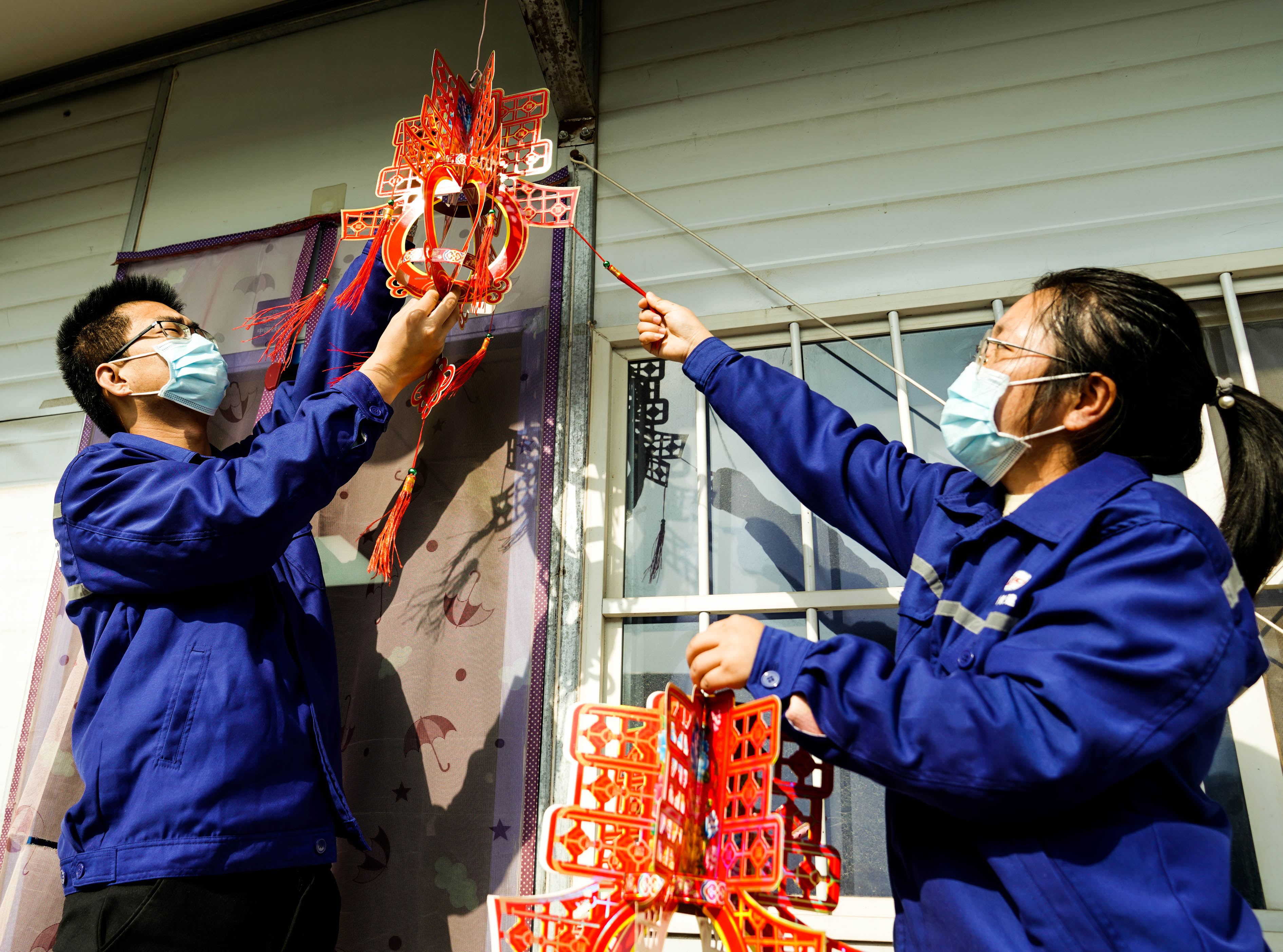 ◈纪甜和常旭东夫妻正在装扮宿舍,为就地过年做准备。新华社发(武君苗 摄)