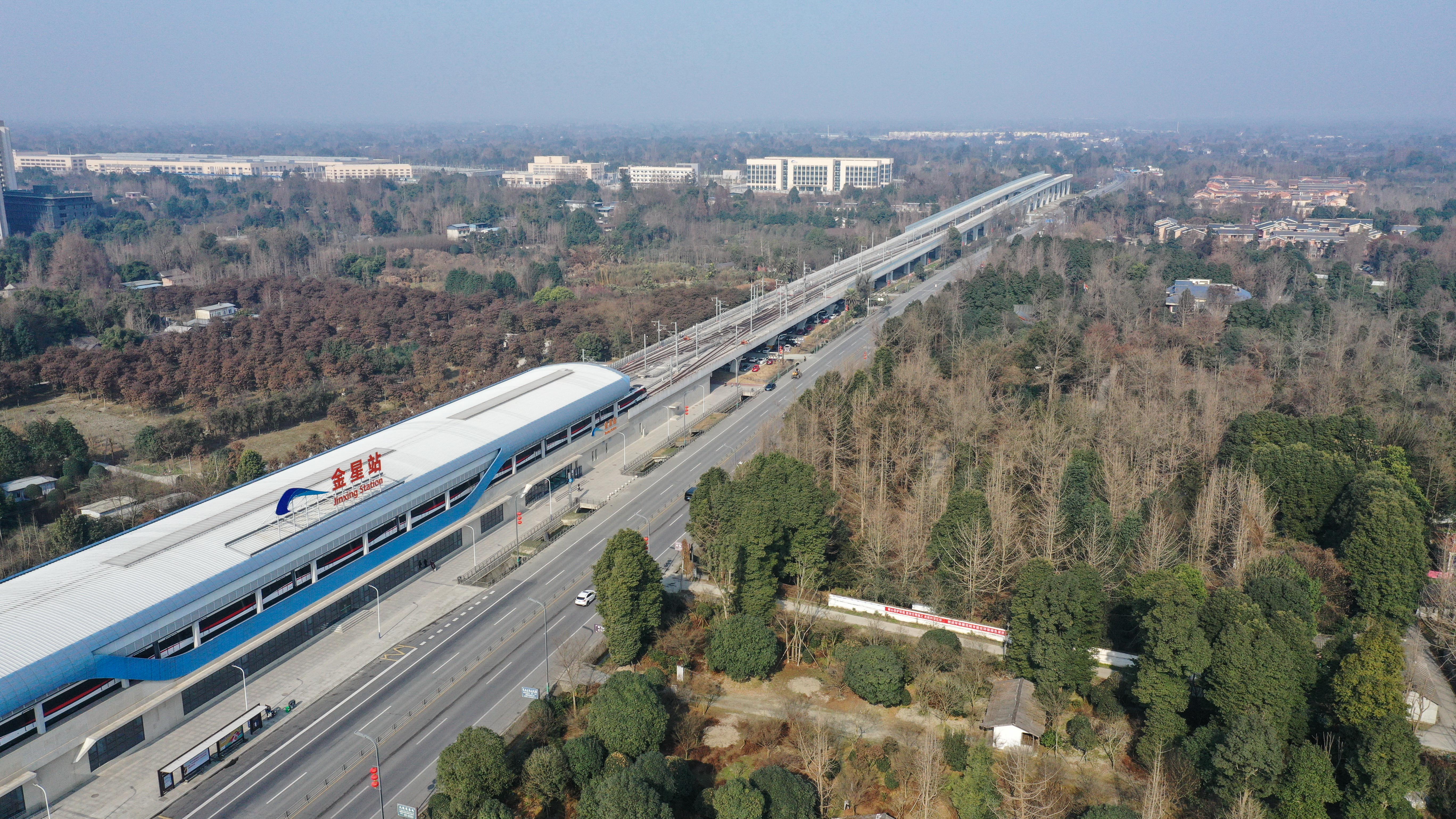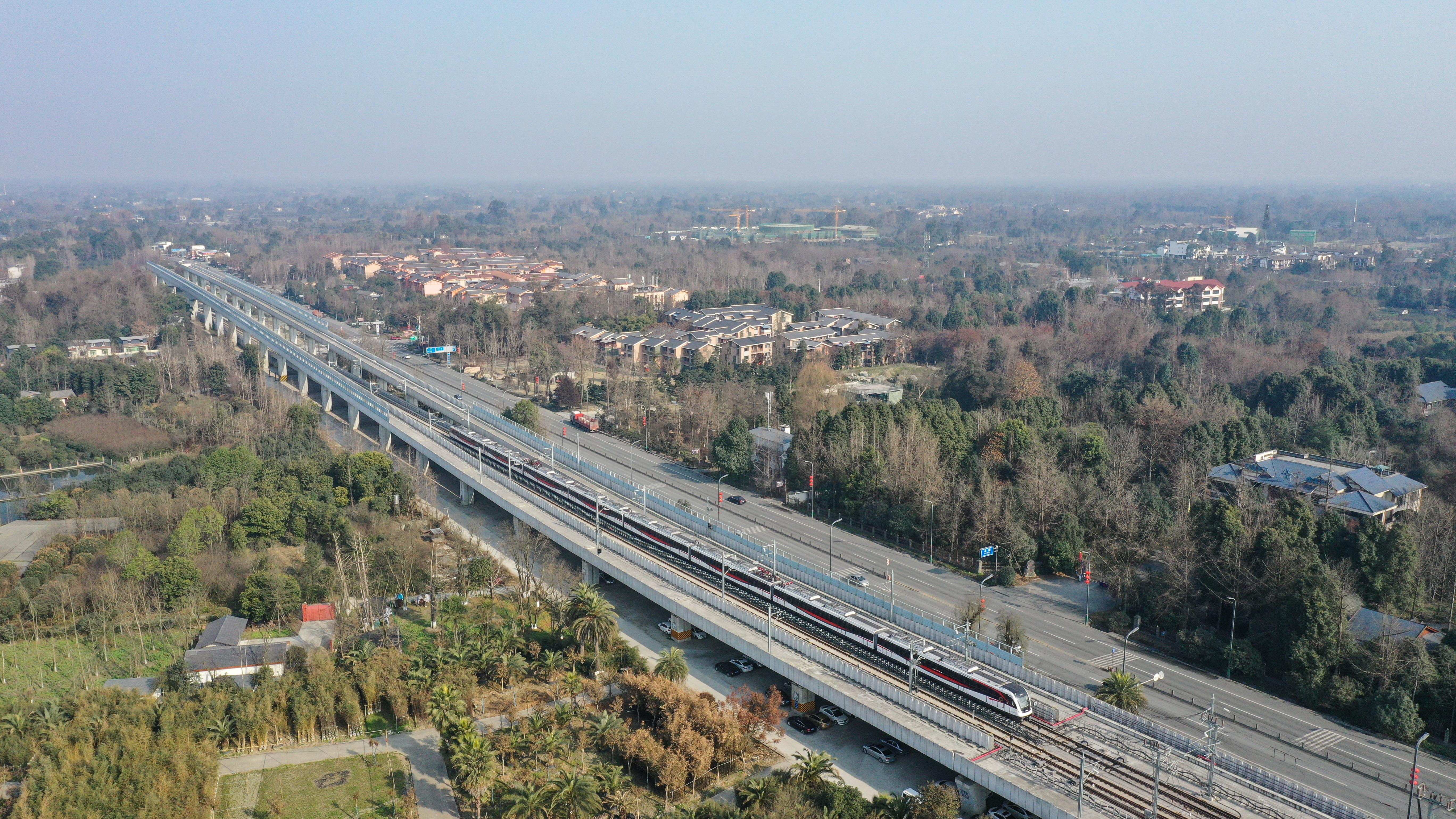 这是2月5日在成都市温江区万春镇拍摄的成都地铁17号线列车(无人机照片)。新华社记者 王曦 摄