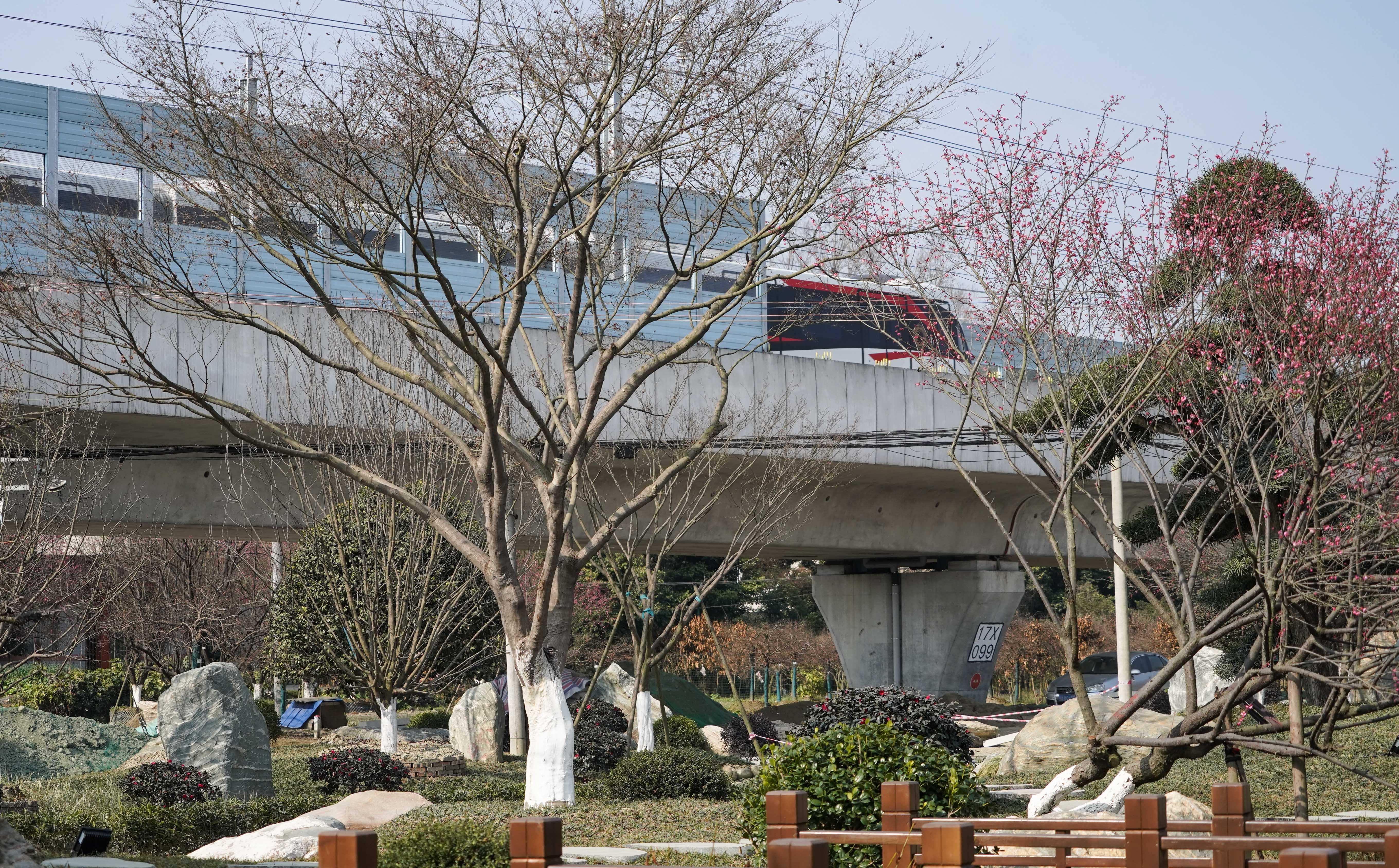 在成都市温江区万春镇,成都地铁17号线的列车驶过高架桥,桥下就是当地打造的花木产业展示区(2月5日摄)。新华社记者 王曦 摄