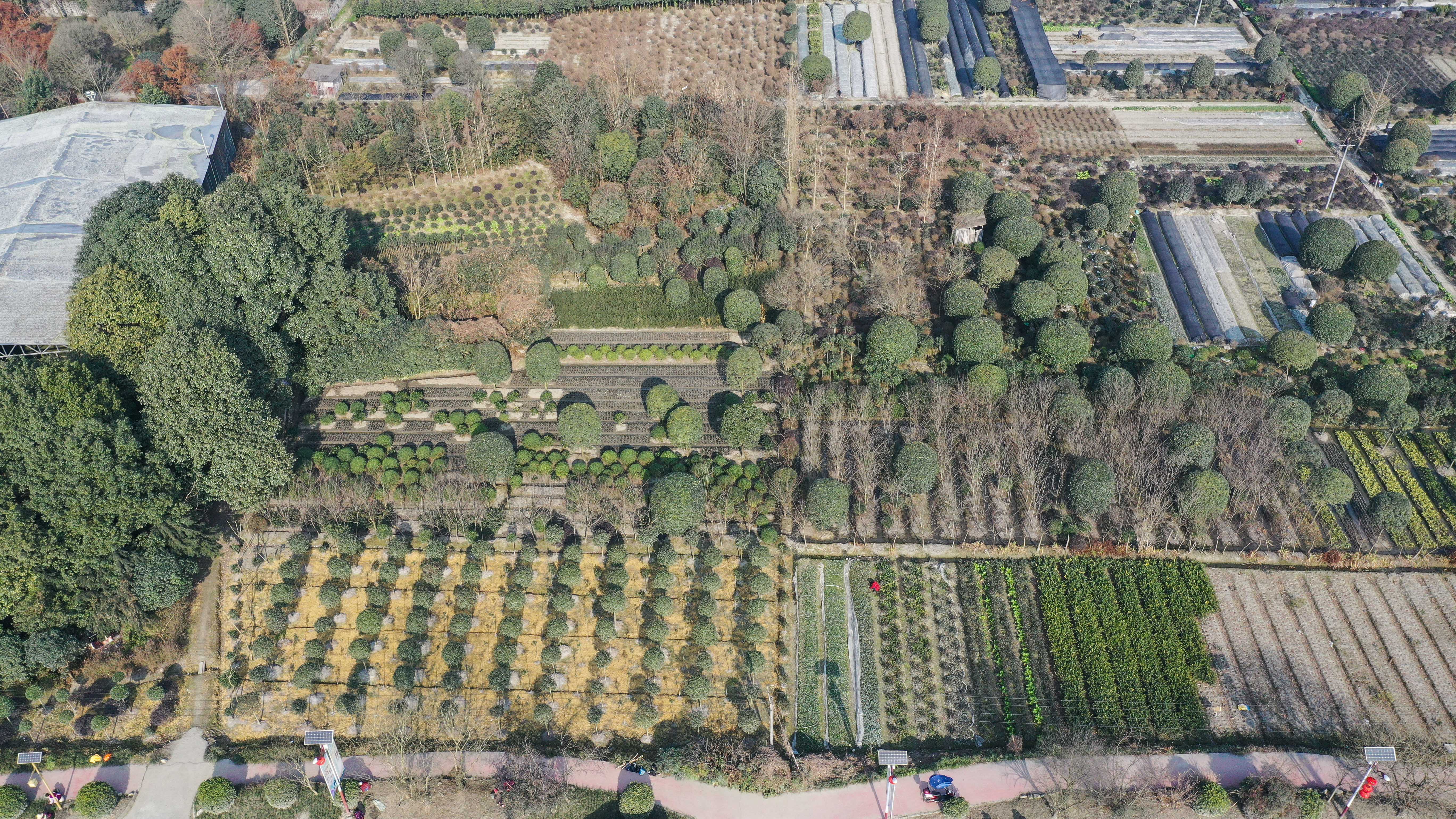 这是2月5日在成都市温江区万春镇幸福村拍摄的花卉苗木产业(无人机照片)。新华社记者 王曦 摄