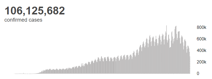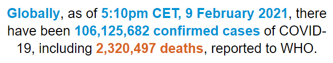 根据世卫组织最新实时统计数据,截至欧洲中部时间2月9日17时10分(北京时间2月10日0时10分),全球累计新冠肺炎确诊病例106125682例,累计死亡病例2320497例。9日全球新冠肺炎确诊病例新增304166例,死亡病例新增8021例。(总台记者 朱赫)