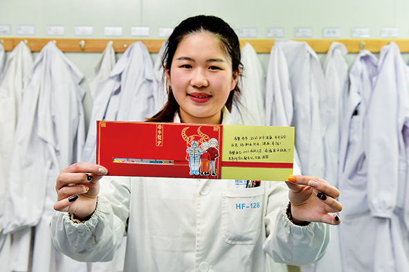 ↑2月2日,合肥迪安医学检验实验室样本处理员柏玉婷手持着写给家人的新年祝福贺卡。