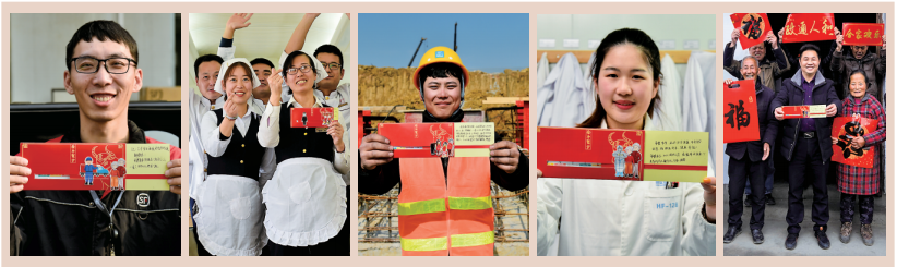 ↑图片从左到右依次为:快递员李洪强、餐车长施凤荣(前排右)、钢筋工张源、核酸样本信息处理员柏玉婷、村支部书记江从明(前排中)。他们手中拿着记者精心制作的贺卡,贺卡上标有思念的“长度”,拉动贺卡寓意“回家”。