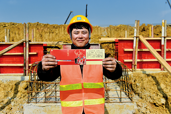 ↑2月4日,聚变堆项目钢筋工张源手持着写给家人的新年祝福贺卡。