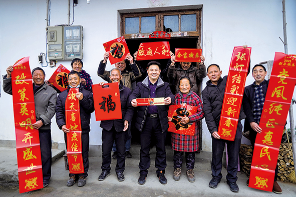 ↑2月5日,安徽省六安市金寨县青山镇尧塘村村支部书记江从明和村民合影。