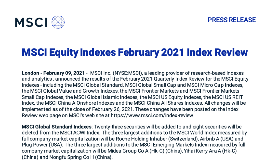 (小标题)MSCI发布指数评审结果
