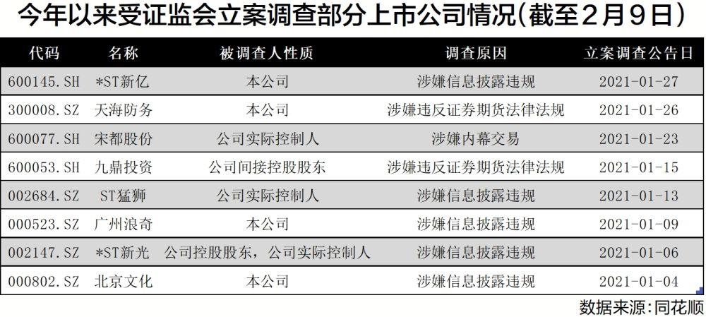 今年以来,上市公司的“严监管”态势明显。证监会2月5日公布的数据显示,2020年全年,证监会共办理案件740起,同比增长34%;全年向公安机关移送及通报案件线索116件,同比增长一倍,打击力度持续强化。