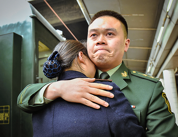 2016年2月3日下午,樊鼎来不及换下军装,就从他执勤的广州南站调班,赶到30公里外的广州东站,雷云值乘的临客列车将在这里靠站。