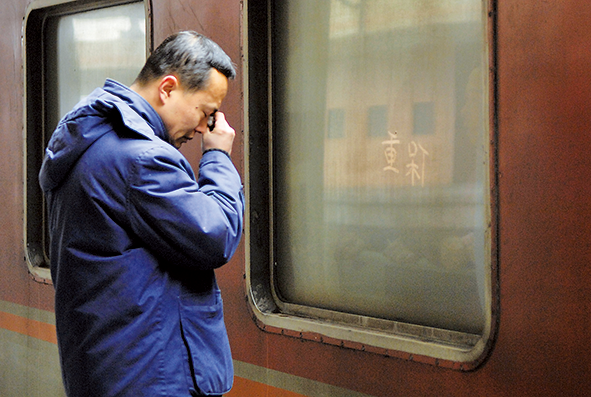 这时乘客们已经基本都上车,站台上留下不多的送站旅客。车窗里两位老人,一位正在擦拭眼睛,另一位在小本子上写字,再透过窗户拿给车外的中年男子看。两位老人挥手让站台上的男子先走,他却一直站着,不断低头拭泪。小小的车窗成为临别沟通的桥梁,玻璃上的“保重”则是他们对彼此最深情的叮嘱。