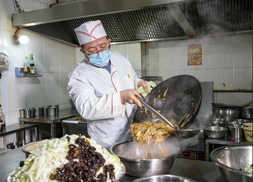老板翟富祥正钻在厨房里炒过油肉,老板娘肖秀花正戴着口罩和手套,忙着和员工将热腾腾的豆腐丝、米饭和馒头装盒、扣盖、码放进保温箱。