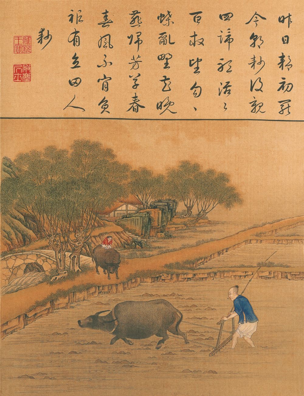 四阿哥下田赶牛。胤禛耕织图册 故宫博物院藏