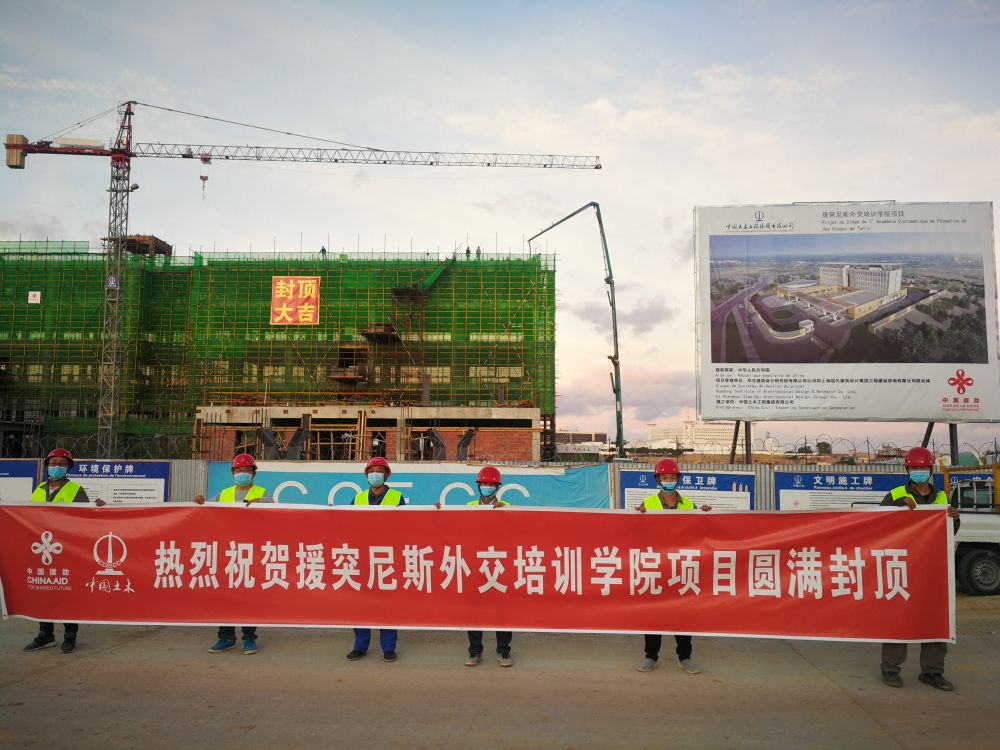 中国援建突尼斯外交培训学院项目主体工程于10月30日完成封顶。新华社发