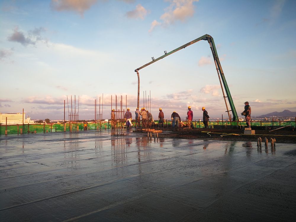 中国援建突尼斯外交培训学院项目工程人员在项目工地进行最后的浇筑。新华社发