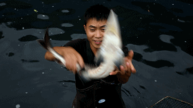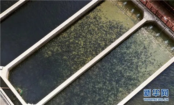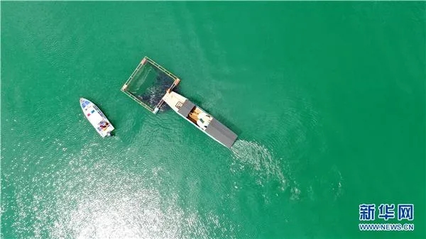 光照湖(牂牁江)渔场工作人员将捕捞的鱼儿放入暂养箱。新华网 卢志佳 摄