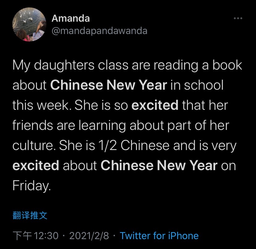 “我女儿的班级这周正在读一本关于中国春节的书,她很开心朋友们正在学习她的文化。她是中国混血,她对周五的中国春节感到十分兴奋。”
